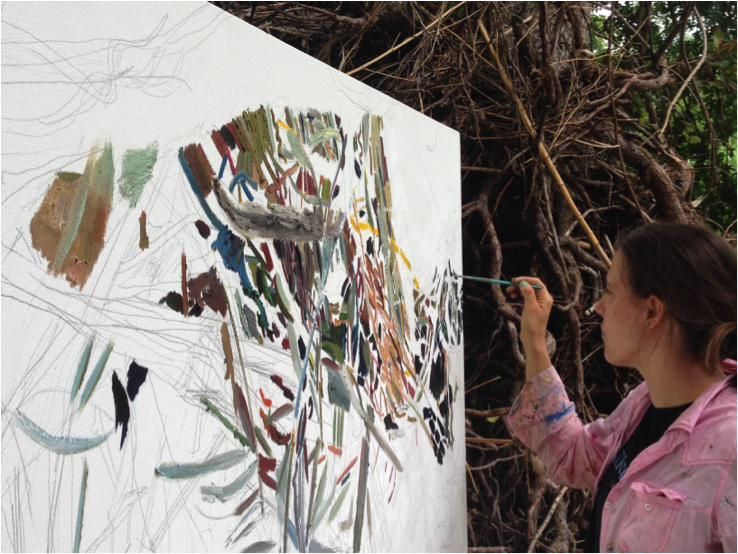 This July we were lucky enough to host our own artist in residence, Erika Huddleston. In order to observe changing conditions along the creek, Erika began work on a series of large oil paintings near 9th street and Duncan Park. Focusing on the impact of urbanization, Huddleston conveyed not only the creeks natural beauty, but the detrimental affects of erosion, flooding, and both habitat and water quality degradation.“I am interested in how witnessing natural changes in urban landscapes – such as flood debris that reveals the long gone rise in waters – affects the urban parkgoer’s sense of past, present, and future,” said Erika Huddleston, artist.