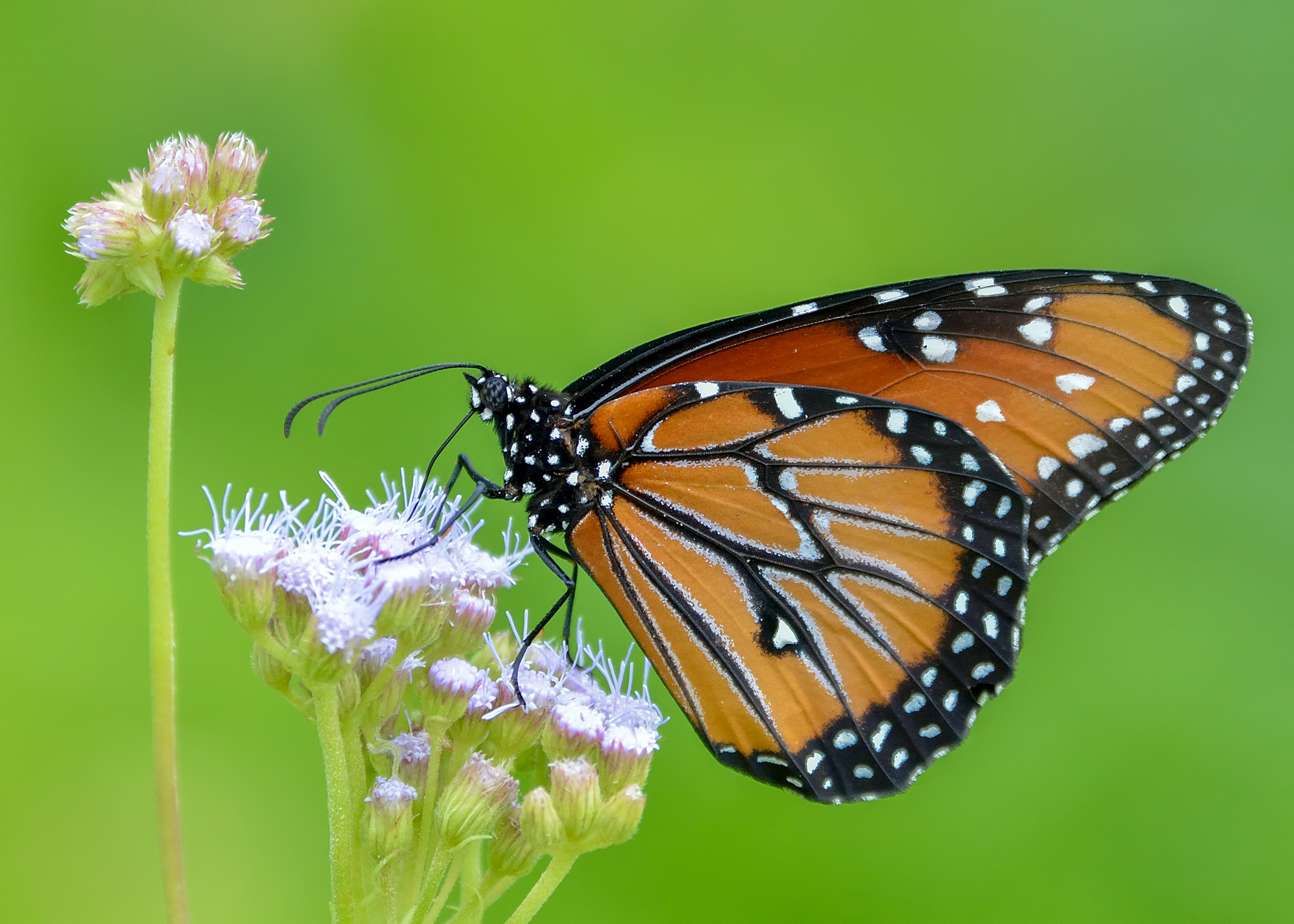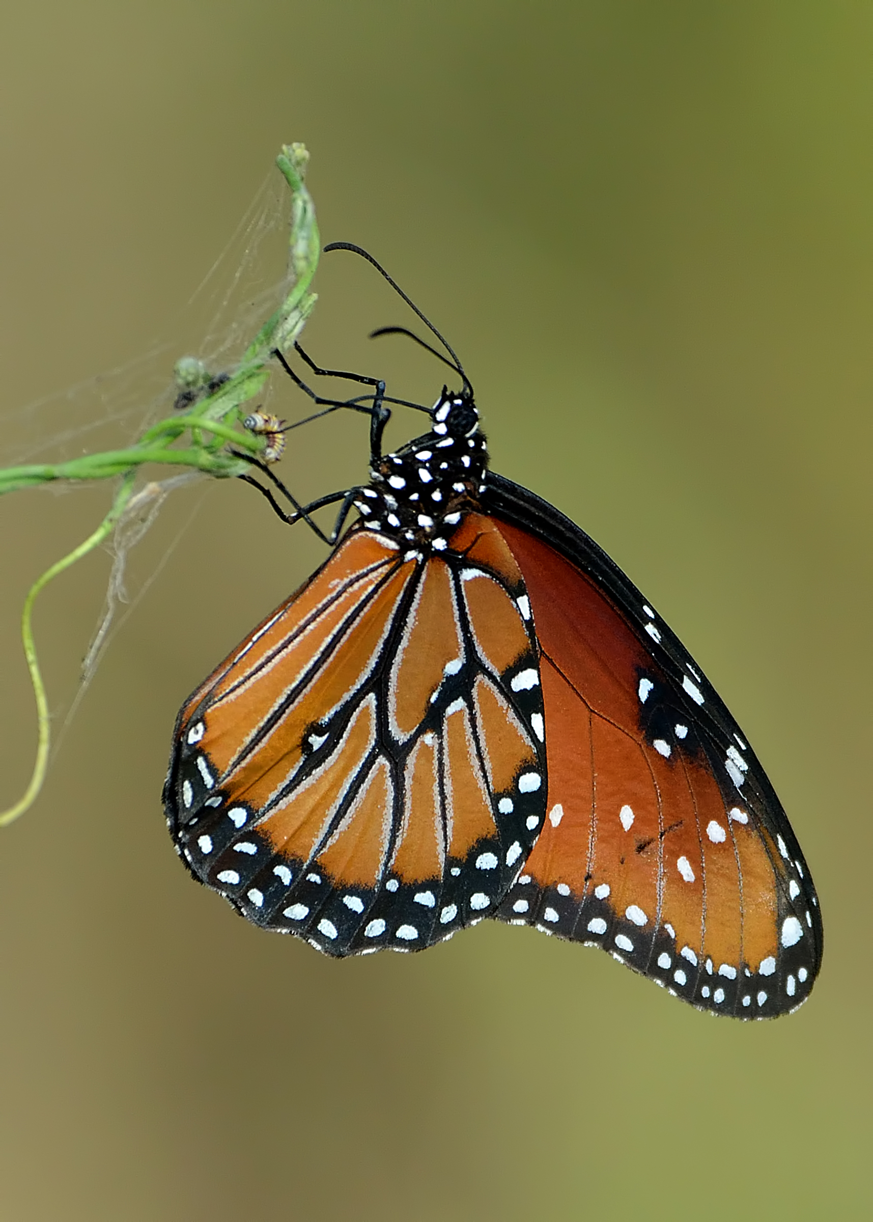 The queen in the image to the right is resting on this vine after feeding at the nearby flowers. Look closely at the vine just to the left of her thorax. See that tiny caterpillar? That is the queen caterpillar, feeding on the leaves of the same milkweed.