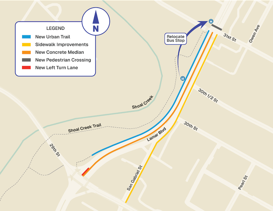 In November 2025, the City began construction on the intersection and safety improvements between 29th-31st Street (click the map below for a closer look). These include a new paved trail with a buffer on the west side of Lamar Blvd, a new southbound left turn lane on Lamar Blvd at 29th Street, a new pedestrian crossing at Lamar Blvd on the north side of 31st Street, ADA accessible upgrades to sidewalks, and more. Construction is expected to last approximately one year and may involve some amount of sidewalk, trail and lane closures.
