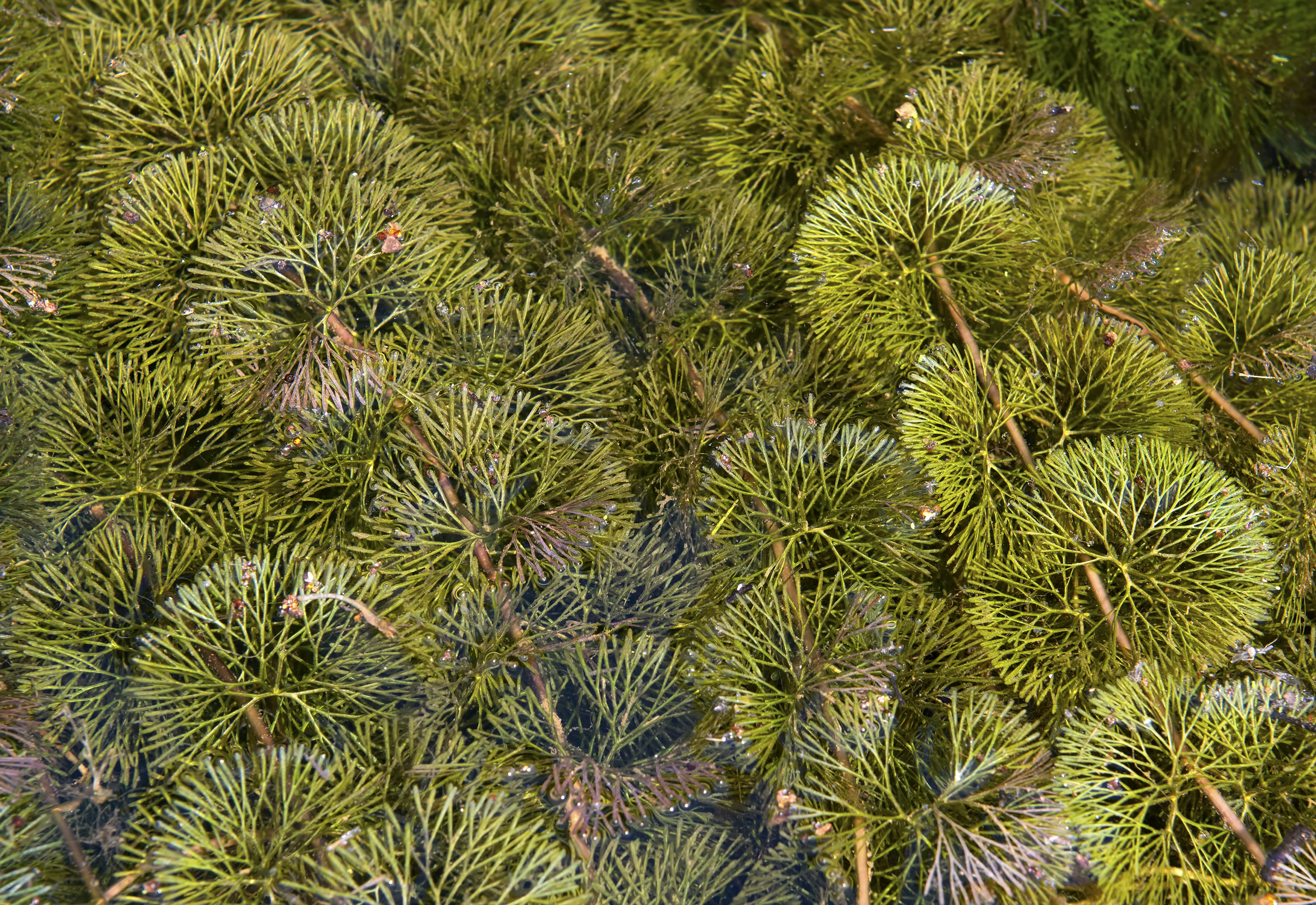 The profusion of trash in Lady Bird Lake has been particularly apparent this summer. Fanwort (Cabomba), a native aquatic plant, has spread to cover most of the lake this year. Fanwort roots in the sediments of slow-flowing streams and lake, and the stems reach upward to the surface of the water. Fanwort can become established in water as deep as 10 feet. Fanwort has only recently become well established in Lady Bird Lake, perhaps the result of the recent drought.